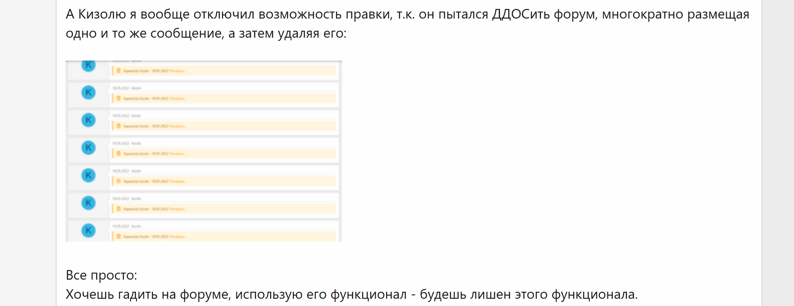 До того как запретили заикаться о расхождениях с генеральной линией партии и правительства форум становился площадкой для срача в том числе и по моей вине, теперь всё это застолбится уже без всякого моего участия. Потому что у нас в стране сейчас есть два мнения- то, что тебе вещают Российские СМИ и неправильное. И для того чтобы неправильных мнений не было придумана и узаконена система штрафов и сроков, где за отход от генеральной линии можно схлопотать как минимум штраф, как максимум срок, и немаленький. Поэтому вангую: Скоро Алексей будет вымарывать всё, что не совпадает с генеральной линией, а если он этого не сделает- последует неминуемое наказание. И он всё равно откорректирует контент в соответствии с поступившей вводной.