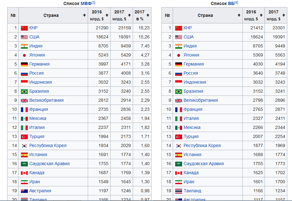 ! Вы из нее вообще ничего не понимаете!Там Индия на 7 месте к вашему несчастью я и в Индии бывал и она разительно отличается от той что показывает Нейшенел Географик или Болливуд, там люди испражняются по среди улицы, в одном месте видел даже труп на улице лежал над которым уже мухи летали! Мексика там тоже где-то на 13 месте! Трамп теперь от этих богатеев стену строить хочет что бы не лезли!! Этот ВВП, показатель уровня экономики только если и ВВП на душу населения (по покупательской способности) тоже на том же уровне! А ВВП на душу населения в России где-то на 50-60 месте