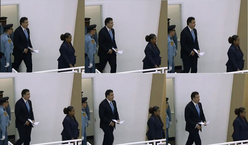 Следующие 6 стоп-кадров запечатлели Саакашвили, который перед тем, как подняться на трибуну, по регламенту садится на стул перед сценой. На них видно, как