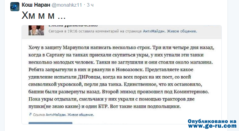 «Зашевелились и ускорились наши господа, в решении вопроса о создании резервации для инакомыслящих (по другому территорию с „особым статусом“ назвать нельзя. Сегодняшнее заявление г. Плотницкого о согласии ЛНР с законопроектом Порошенко, ни что иное как белый флаг!