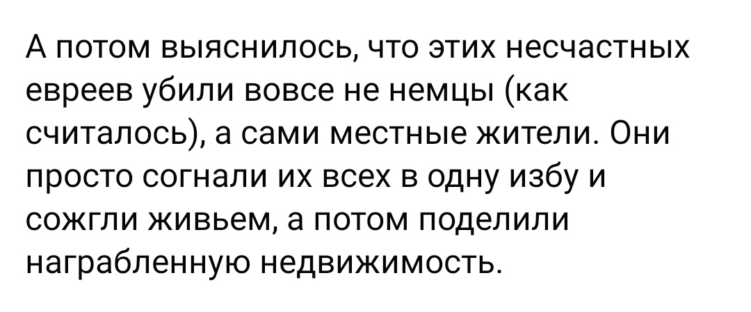 Трагедия современности - в том, что половина восточной Европы - это Едвабне. Немцы немцами, но всю черную работу по очищению "Остланда" делали местные, порой - с большим энтузиазмом. И восточная Европа сегодня дружно, не сговариваясь, молчит об этом и рот открывает только когда надо напомнить про Риббентропа-Молотова.