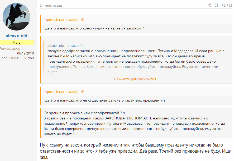 В третий раз и в последний: каком ЗАКОНОДАТЕЛЬНОМ АКТЕ написано то, что ты озвучил - о пожизненной неприкосновенности Путина и Медведева, что президент неподсуден пожизненно, когда бы ни было совершено преступление, что если он захочет кого-нибудь убить - пожалуйста, ему за это ничего не будет ?