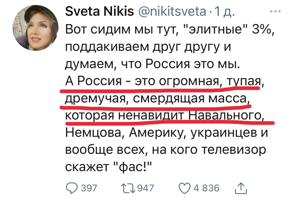 А чё не правда, что ли? Ведь только 3% россиян сидят в интернете и знают правду, а все остальные в телевизоре... У нас ведь тоже есть такие, кто считает, что на нас - их оппонентов, влияет телевизор...Все посты и картинки от "ватников" должны быть одобрены на совете форумных "элитных"засранцев"светлоликих"