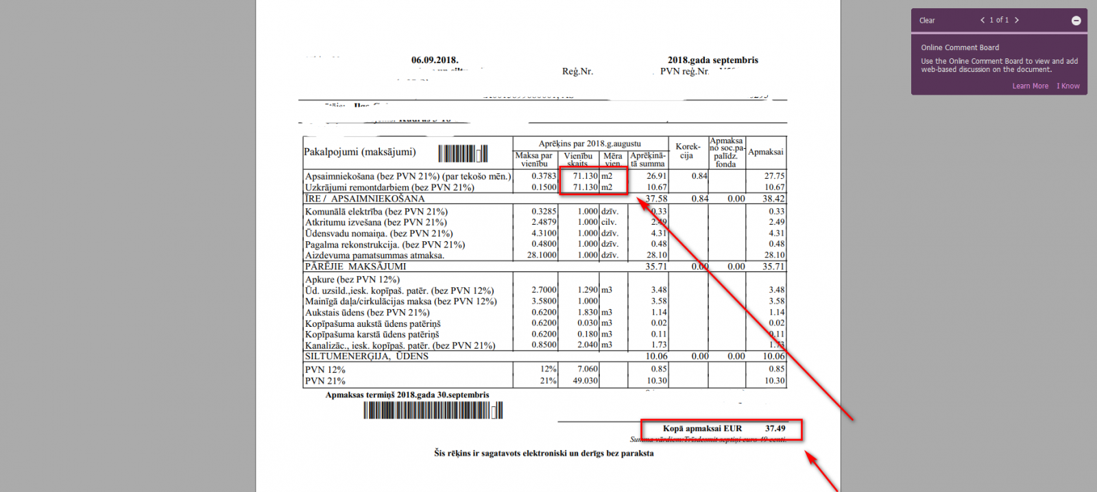На фотографии вверху страницы Вы видите пример счета в новостройке в центре Риги. Внутренняя площадь квартиры 56,4 кв.м, общая площадь вместе с балконом 60,7 кв.м. Счет выписан в апреле, и в нем идет оплата показаний счетчиков за март, когда целый месяц было включено отопление.