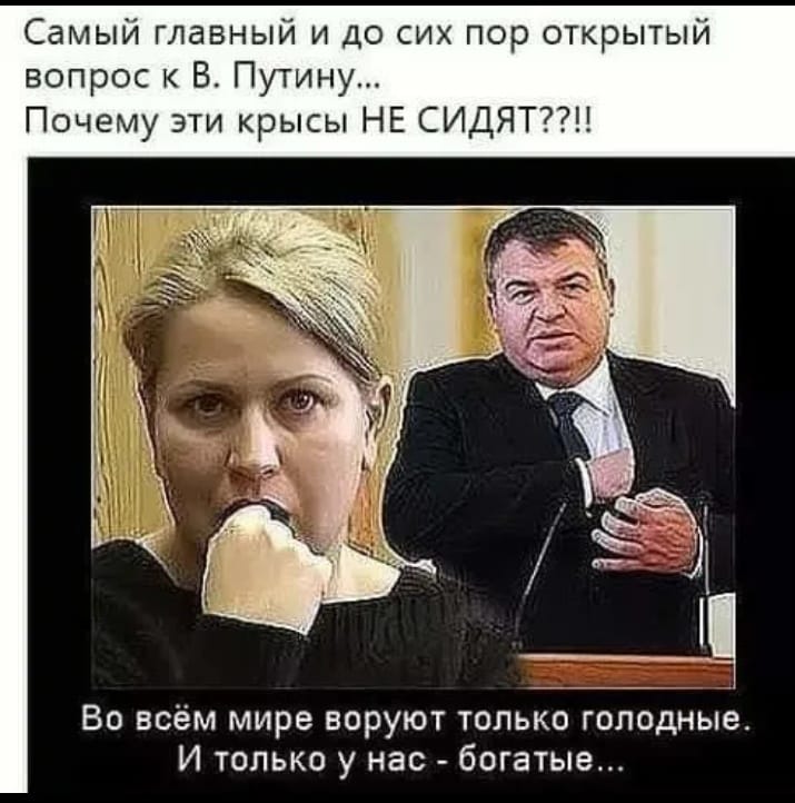 Ты как-то тут мне на то, что я сказал про полковника ФСБ, у которого 12 ярдов кэша изъяли, указала, что арестовали его ФСБшники. Типа- ну работают же... Итак, давай вспоминать. Сердюков и Васильева. У которых тоже дома был склад кэша. Сердюков- вообще ушёл от любой ответственности и возглавляет сейчас госкорпорацию, Васильева якобы отсидела в колонии целый месяц, правда в этой колонии её так никто и не увидел ни разу. Таможенник Бельянинов, у которого дома тоже был склад кэша. Больше сотни лямов. Больше не таможенник, он теперь глава государственного Евразийского банка, а деньги ему обратно вернули. Экс- министр Абызов. Буквально на днях сняли арест со счетов. Теперь ждём, когда Захарченко деньги вернут. А потом и полковнику ФСБ Чекалкину про его 12 ярдов скажут, что всё законно. А потом нам в очередной раз скажут, что в бюджете не хватает денег и надо поднимать налоги, это трудная, но необходимая мера.