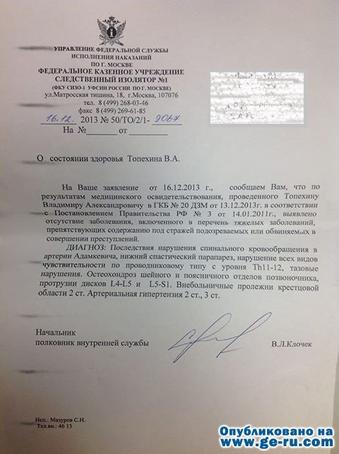 Пресс-служба суда заявила, что после медицинского освидетельствования врачебная комиссия не обнаружила у Топехина заболеваний, препятствующих содержанию под стражей