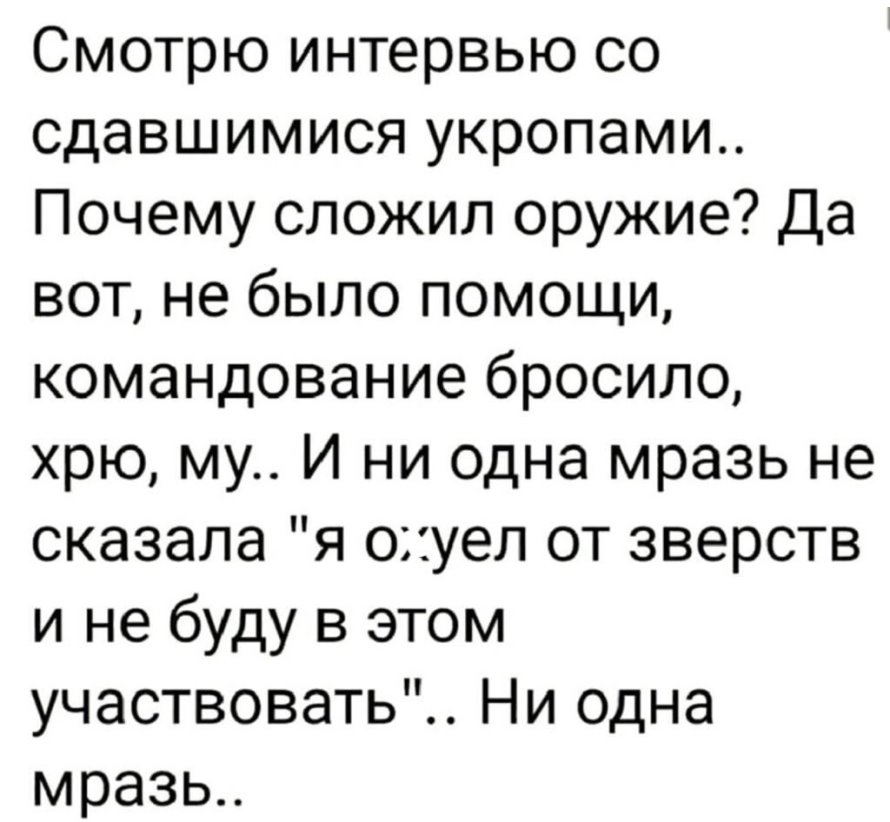 Вот о чего же вы тут мерзкие... Вы сначала тут сами пишете, что нельзя руководствоваться никакими вопросами гуманности по отношению к украинцам, вне зависимости от того, военные они или мирные, некоторые особо рьяные кухарки даже предлагают мирных украинцев в расчёт не принимать при военных действиях, а тут ну надо же- прям такая забота о зверствах в отношении украинцев, шо пестец. Чмошники вы.