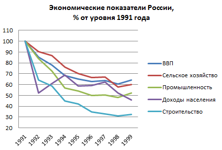 Это откуда ты такие данные выкопал ? Посмотри Росстат, МВФ, ЦРУ в конце концов ! И да выучишь ты наконец хоть один язык !В 1999 году экономическое положение России находилось под влиянием двух важнейших факторов: последствий финансового кризиса и обвала рубля августа 1998 года и высоких цен на нефть на мировом рынке в продолжение большей части ушедшего года.
