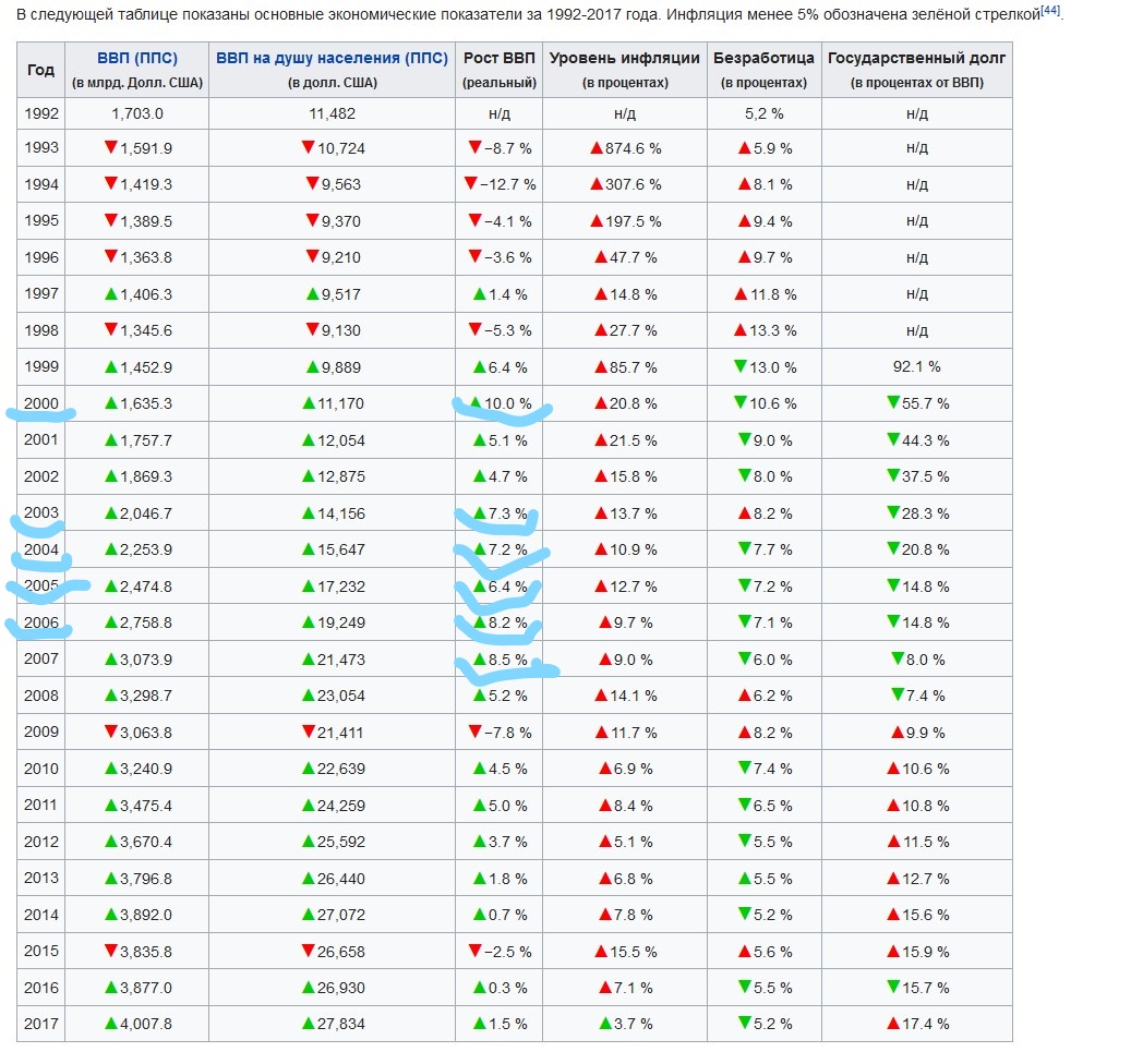 Вова, ты усираешься- доказываешь, что мы не понимаем всего счастья жить в стране под руководством Путина? Да, прикинь, я лично не понимаю этого счастья. Рон ещё выдерживает, он тебя практически не знает, я тебя знаю очень давно, и этой цифровой эквилибристикой я своё уже отзанимался. Вова, я тебе, нерусскому, уже сказал: Россия превращена в страну- бензоколонку. Начала она это превращение ещё при Ёлкине, когда власти вообще было до фонаря, что в стране с экономикой делается, они занимались дележом того, что досталось в их распоряжение, но при Путине превращать Россию в страну- бензоколонку стали уже вполне осознанно, сознательно гнобя все несырьевые отрасли экономики. И вот привёл ты вот эту вот замечательную табличку- а я тебе скажу про неё. Конкретно про тот самый столбец, который ты с гордостью выделил. Возьми, разрисуй темпы роста в диаграмму где по одной оси будут годы, а по другой- проценты темпов роста- падения, и наложи его на диаграмму роста- падения цены на нефть- она совпадёт один к одному. То есть наша экономика намертво привязана к цене на нефть. О чём это говорит? О том, что без нефти у нас никакой экономики нет. Совсем. Вообще нет. Потому, что если бы это было не так, Вова, у нас бы экономика так не прыгала вслед за ценой на нефть. Ни одна другая экономика так не реагировала на график изменения цены на нефть. Ни одна, Вова, только российская. Команда Путина построила за 20 лет страну- бензоколонку. И не вспоминай мне про Ельцина- с того времени, как он не у власти уже 20 лет прошло. 20 лет, Вова. Столько не живут. И что создано за это время? Ну, кроме страны- бензоколонки? Что при Путине восстановлено из того, что потерял Ельцин? Ничего. Что растеряно из того, что ему досталось от Ельцина? Список можно писать бесконечно. Но самое главное, Вова- это то, что в поисках врагов, которые не дают гениальному Путину строить страну, Россия действительно стала врагом всем. Всем, без исключения. Назови хотя бы одну страну, Вова, которая нам не враг? Нет такой страны, Вова. Нету. У нас вокруг действительно одни враги.Основные экономические показатели